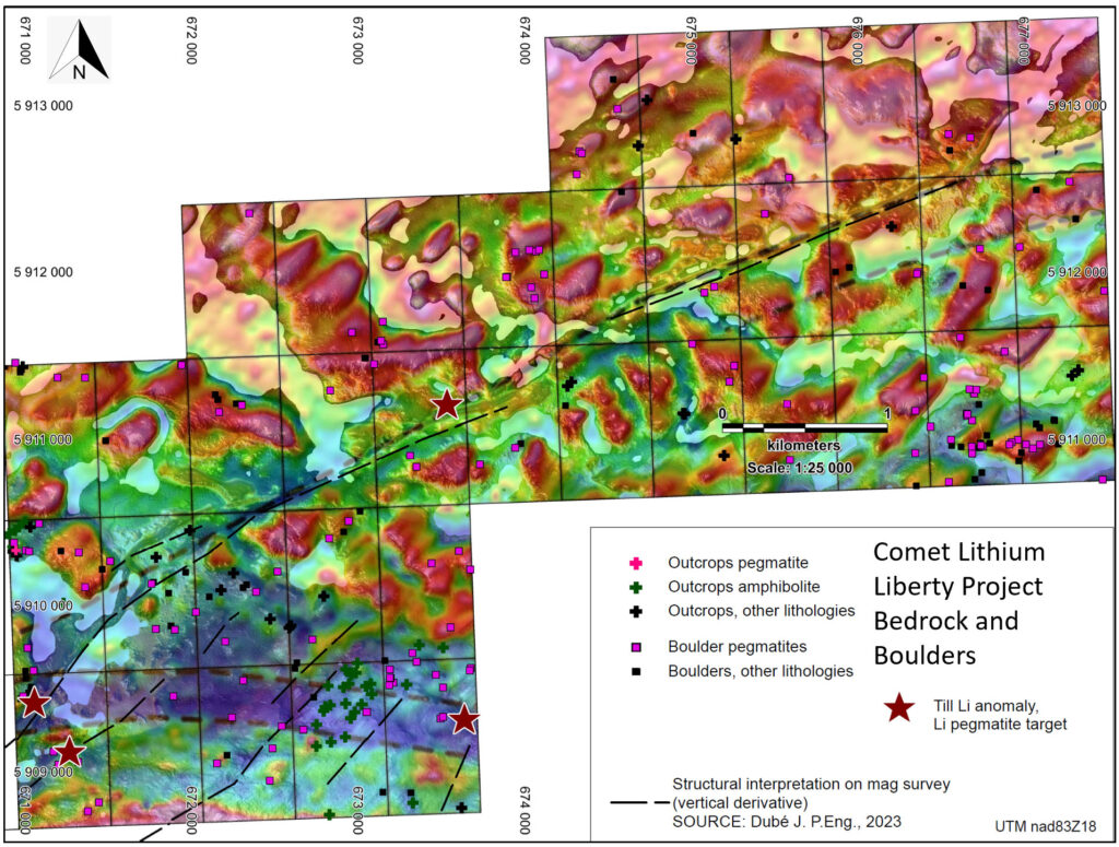 Rouyn-Noranda, Québec, Canada, February 8, 2024 – Comet Lithium Corporation (TSXV: CLIC) (FSE: 8QY) (“Comet Lithium” or the “Corporation”) is pleased to report and provide results from the maiden field program that was conducted on the Liberty property (the “Property”) in September 2023. The field team spent a total of 14 days on the Property, which also included some work on the Galli project located approximately 15 kilometres (“km”) east from Patriot Battery Metals’ Corvette project. The field team followed the north-east trend previously identified by the magnetic and LiDAR surveys and on strike with the lithium pegmatites at the neighboring Adina lithium deposit (the “Adina Property”) held by Winsome Resources Limited. The field team was able to proceed with the identification of a series of anomalous lithium till samples along the north-east trend (see Figures 1 & 2). During the field program on the Property, an additional anormal lithium area in the south-west corner and on strike with the Adina Property was identified. Throughout the program, the field team was able to identify several large sub-crop frost heaves block and glacial boulders and erratic blocks of pegmatite in an overburden covered landscape with sporadic outcrops (see Figure 3).