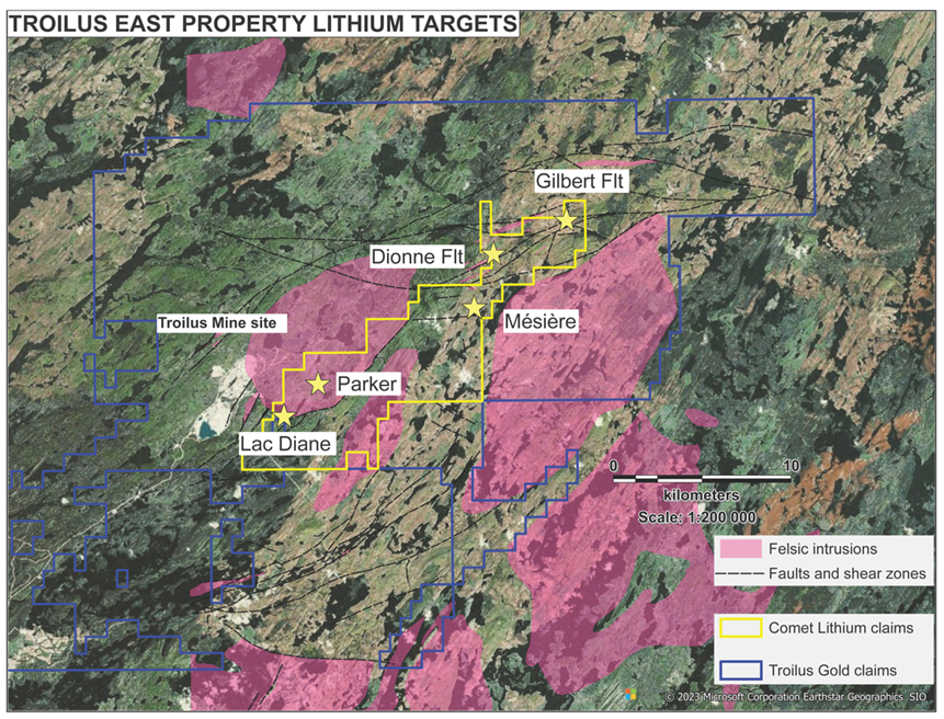 Rouyn-Noranda, Québec, October 16, 2023 – Comet Lithium Corporation (TSXV: CLIC) (FRANKFURT: 8QY) (“Comet Lithium” or the “Company”) is pleased to announce that it will be commencing a lithium focused exploration program at the 100% owned Troilus East property, located in Eeyou-Istchee Baie James, Québec. The past exploration program completed at Troilus did not take lithium into consideration but it succeeded in identifying lithium anomalies. The new work program will target these areas for pegmatite prospecting.