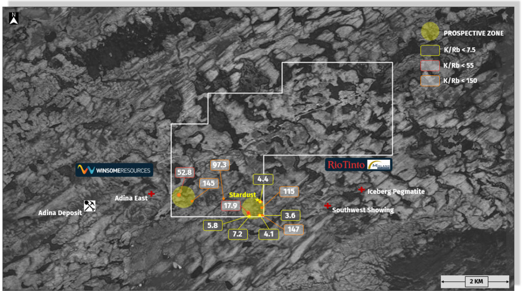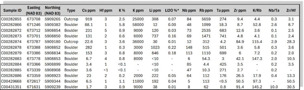 - Seven anomalous angular boulder and outcrop samples reported K/Rb ratio values below 55, with five samples showing ratios below 7.5, indicating strong potential for LCT pegmatites.