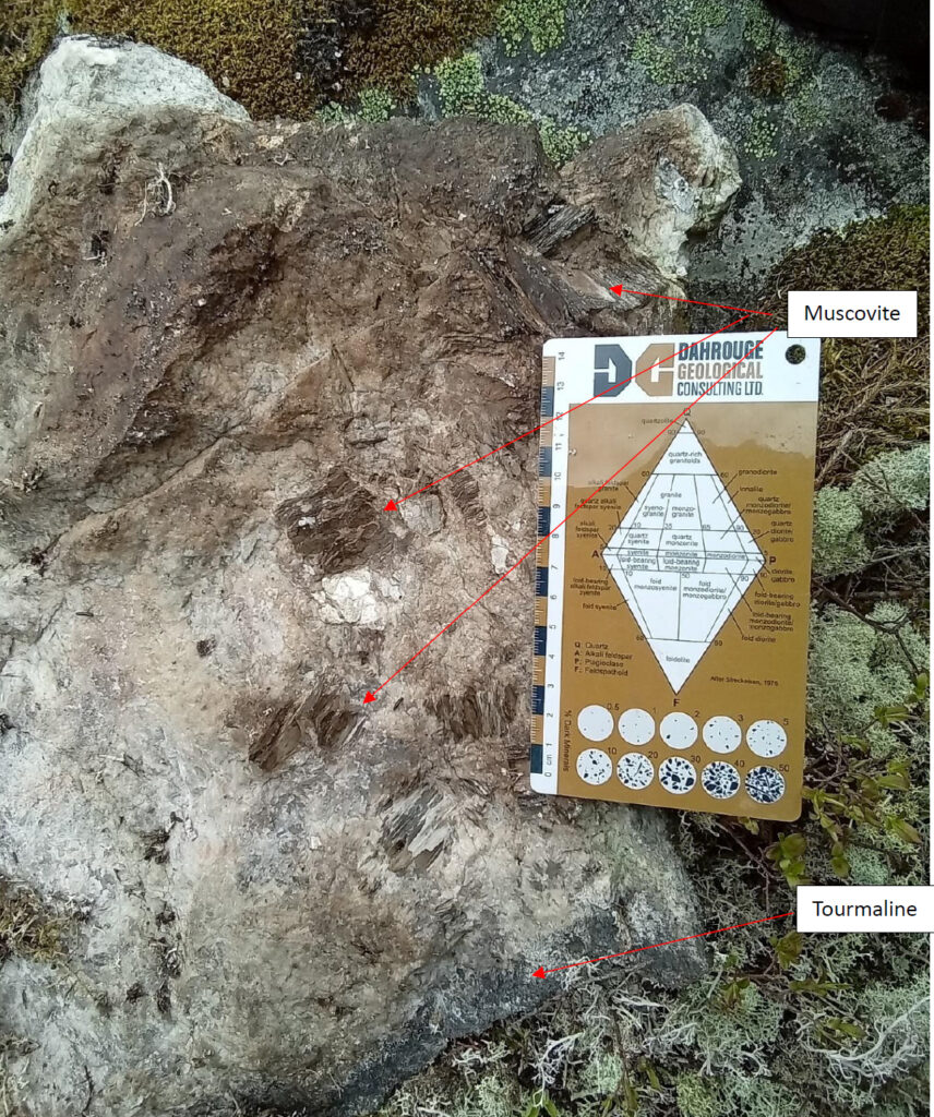 Numerous outcrops of amphibolitized basalt were identified in the southeastern area of the Liberty Property. Several tonalitic dykes were observed and sampled, along with numerous blocks of felsic intrusive rock, some of which were pegmatitic. Underneath and adjacent to thick vegetation cover, a north-south striking pegmatite dyke measuring between 50 and 100 centimetres in thickness was observed over a length of 3 metres (see figure 2). The Stardust dyke displayed white pegmatite with 5-10% large muscovite crystals and 1-5% black and green tourmaline (see figure 3). The sample C00282855 returned a K/Rb ratio of 4.4 and assayed 5,659 ppm Rb, 919 ppm Cs, 274 ppm Ta, and 0.07% Li2O. The dyke was manually excavated, but further tracing was not possible due to the increasing thickness of the overburden in the area.