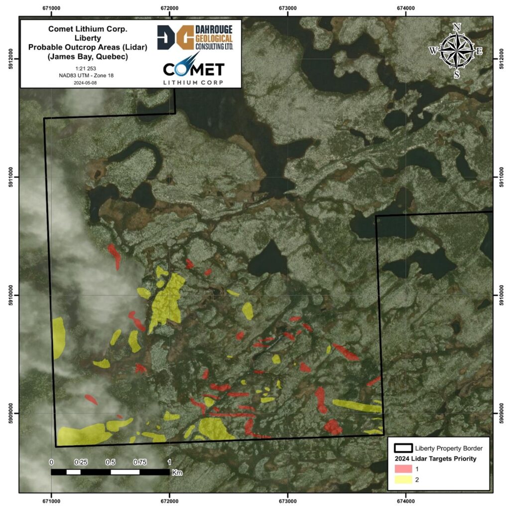 “We are thrilled to launch the 2024 Phase 1 Exploration Program at our flagship Liberty Property,” commented Vincent Metcalfe, Chair and CEO of Comet Lithium. “With the expertise of our dedicated field teams, we are confident in our strategy to thoroughly investigate and traverse the high-priority target areas. This field program is designed to maximize our chances of discovering lithium mineralization, particularly in the most prospective areas identified through LIDAR and gravity survey results. We look forward to the completion of this field program, the results therefrom and ultimately the potential value of the Liberty Property.”