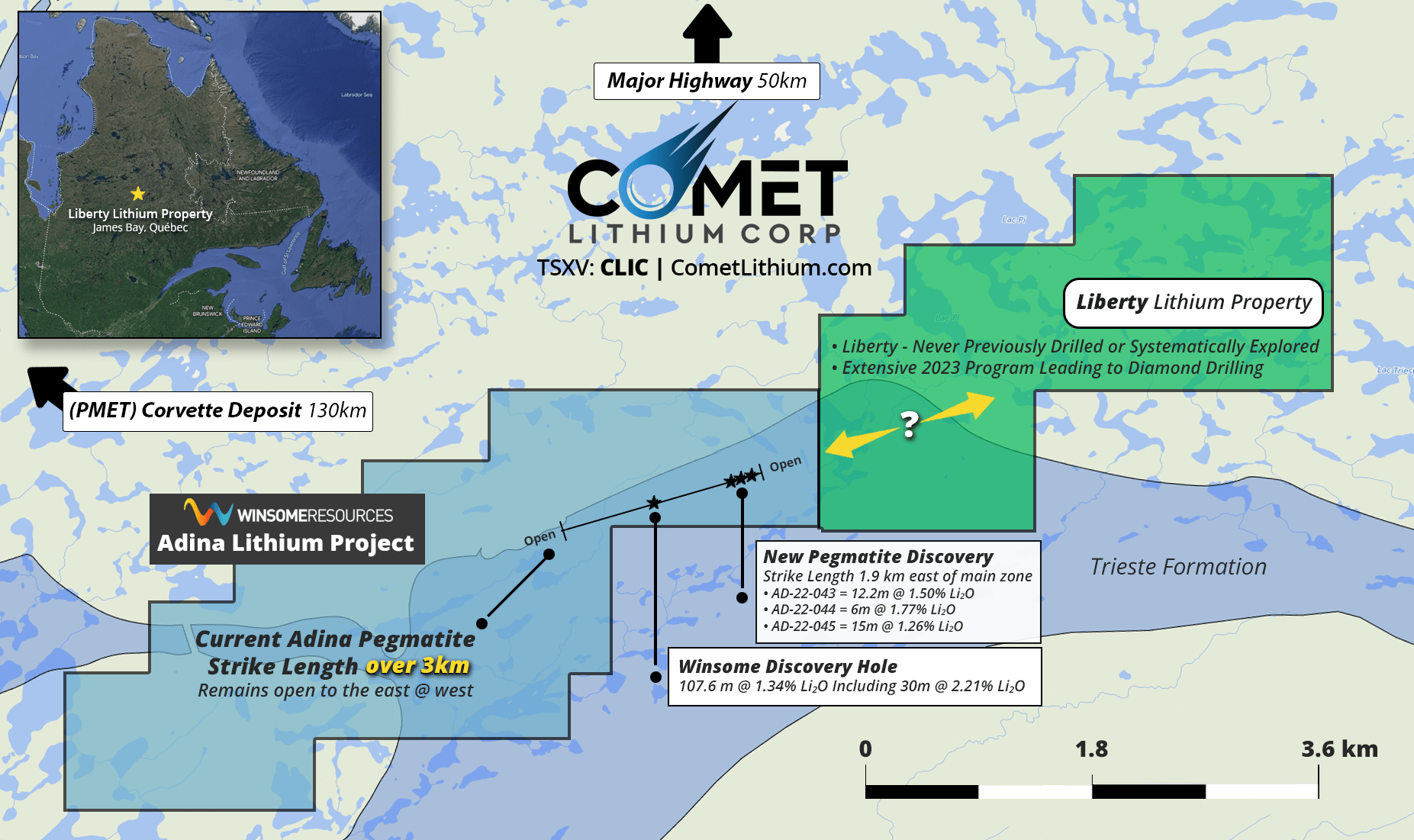 La Propriété Liberty de Comet Lithium témoigne de la vision avant-gardiste de la société au cœur de la prolifique région de la Baie James au Québec. En tant que point focal des efforts de Comet Lithium, la Propriété Liberty souligne non seulement l’engagement de la société à exploiter le vaste potentiel en lithium de la région, mais la positionne également stratégiquement au cœur de l’évolution du paysage des ressources énergétiques durables.
